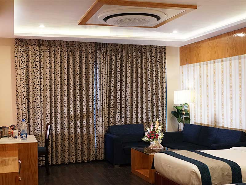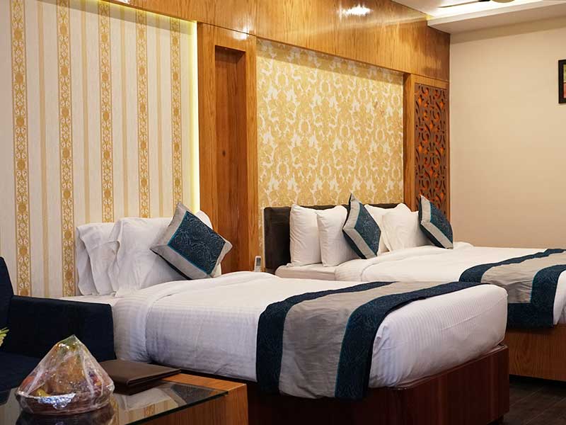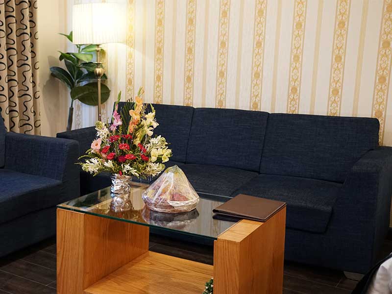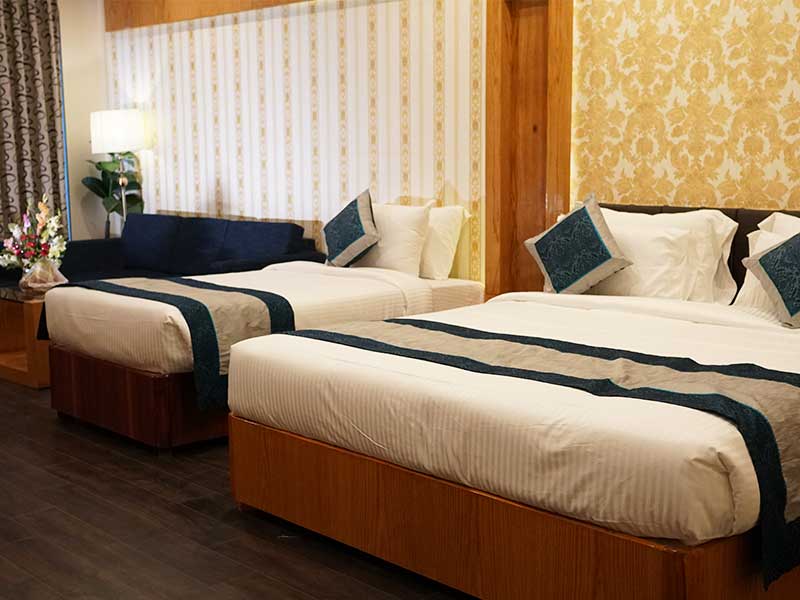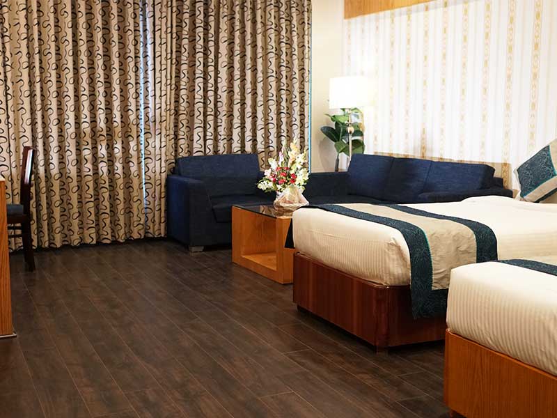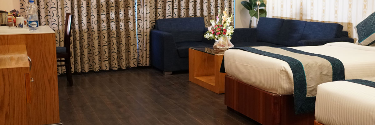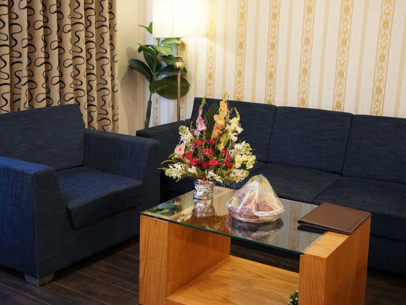 Designed with utmost comfort in mind our Family Suite Rooms are your perfect Varanasi abode. Designed in 418sqft. Family Suite is our luxury hotel room near Ganga Ghats in Varanasi. This room type is ideal for 3 friends or a family with 2 kids. The rooms are super comfortable to give you best night’s rest & sleep after you retreat from unwinding through the city of Varanasi. The best family suite in Varanasi offers a double king size bed along with a single king bed & 4 seater sofa with centre table. The suite has large windows with direct access to sunlight. It also has a work table & mini bar. Start planning your family getaway in Varanasi & experience the most enjoyable stay with your family.